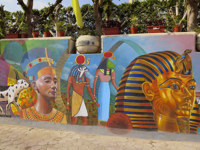 En el parque Al Yazira, ubicado a orillas del río Nilo y a poca distancia de la central plaza Tahrir, el mural ilustra las tradiciones, dioses e ídolos de ambos países, que se juntan simbólicamente en un círculo, en el que un egipcio antiguo y un indio maya dibujan juntos.