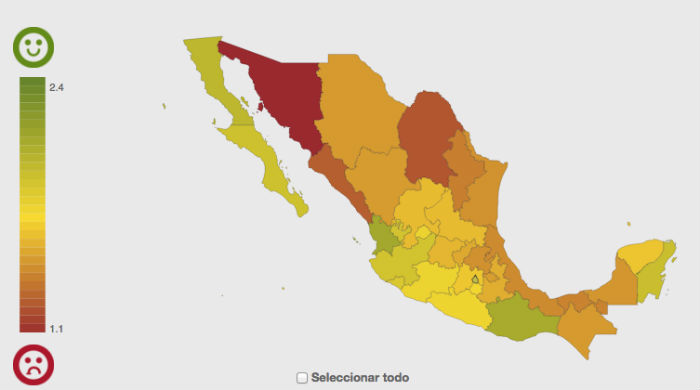 Basados en palabras clave, encontraron que Sonora y Coahuila tuvieron a los tuiteros más tristes, mientras que en Nayarit y Quintana Roo estaban los mensajes más positivos.