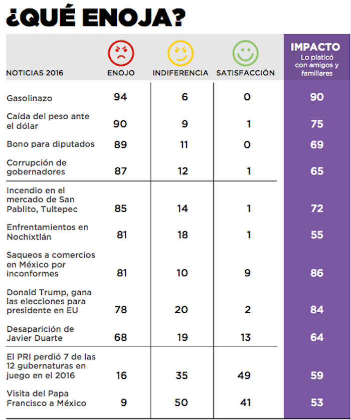 ¿Se acuerdan del 2016? ¿recuerdan que las noticias malas no dejaban de salir a escasos días del nuevo año? Bien, pues todo eso afectó el estado de ánimo de los mexicanos, quienes empezaron 2017 enojados, tensos e incluso con un poco de miedo, de acuerdo con un estudio de la consultora De la Riva Group.