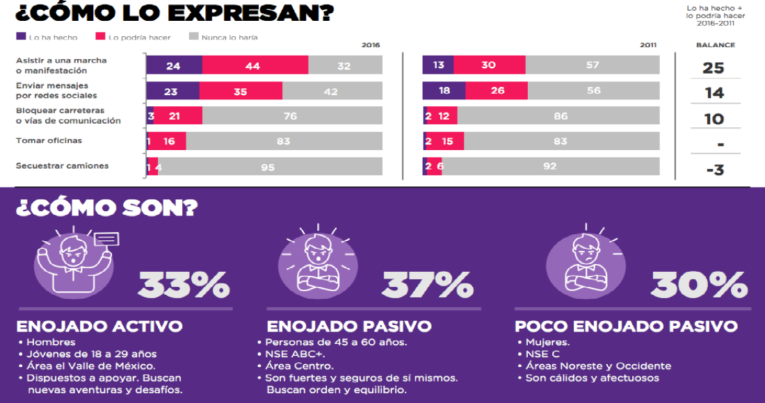 De ellos, se dividen en tres partes depende de la manera en la que manifiestan su enojo: activo, pasivo y poco enojado pasivo. En el primer grupo están los jóvenes de 18 a 29 años que están dispuestos a tomar acciones para hacer que las cosas cambien.