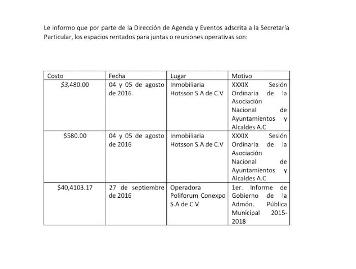 Una gran parte del recurso, 404 mil 103 se destinaron para el primer informe de gobierno y 4 mil 060 pesos se usaron para rentar mobiliario para la 34 sesión ordinaria de la Asociación Nacional de Ayuntamientos y Alcaldes A.C, (ANAC) que es la agrupación de los alcaldes panistas del país.