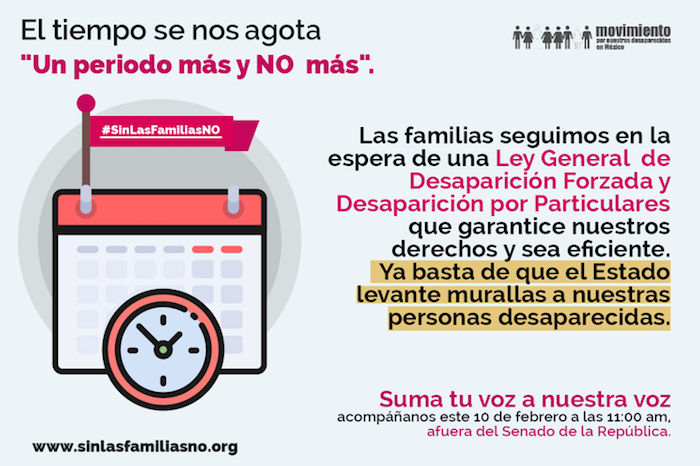 Bajo la determinación de “un periodo más y NO más” las familias de nuestros desaparecidos nos convocan al Senado de la República este viernes 10 de febrero a las 11 horas, para exigir la expedición de la Ley. El tiempo se agota. Ahí nos vemos.