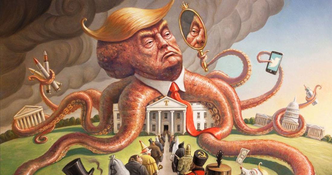 Guerra, suciedad, dinero y el medio ambiente devastado. La religión, un circo y un gran pulpo recién llegado a la Casa Blanca. "Un hombre con una mente estrecha y un ego enorme", un demagogo que usó mentiras, prejuicios y el miedo para llegar al poder. No lo decimos nosotros, lo dice el artista estadounidense Mark Bryan, sobre el nuevo Presidente de los Estados Unidos.