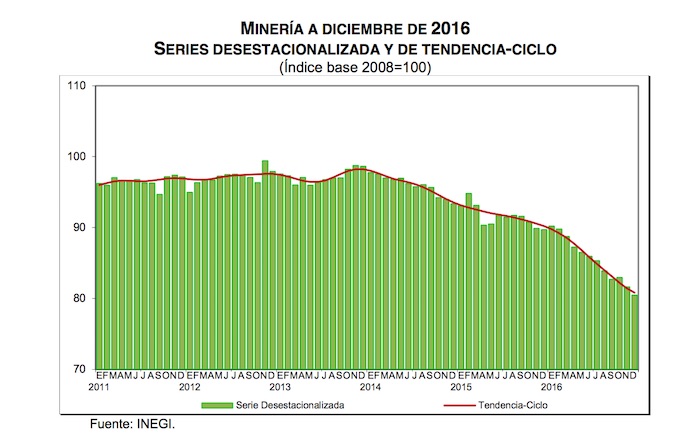 La minería reportó una caída de 1.4 por ciento con respecto al mes anterior y de 10.3 por ciento frente a diciembre del 2015,  el desplome más fuerte desde el 2011. El segundo nivel más bajo fue en septiembre de 2015 cuando el sector cayó 5.3 por ciento.