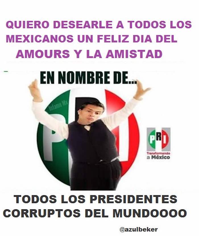 Peña Nieto publicó en su cuenta personal de Facebook, una fotografía en la que se le ve abrazando a su esposa. La fotografía fue acompañada de un "¡Te amo amor!, feliz día". Sin embargo la imagen provocó la burla de los usuarios de redes quienes crearon divertidos memes. A continuación te presentamos algunos de ellos.