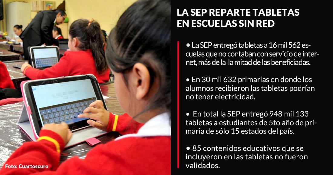 En 16 mil 562 escuelas en donde entregaron las tabletas no contaban con internet, lo que correspondió al 54.1 por ciento del total de los planteles beneficiados, mientras que en 642 casos no existió información si tenían el servicio, señaló el documento.