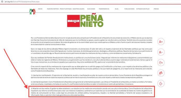 “Como presidente de la República impulsaré una reforma constitucional para crear una instancia ciudadana y autónoma que supervise que la contratación de publicidad de todos los niveles de gobierno en medios de comunicación se lleve a cabo bajo los principios de utilidad pública, transparencia, respeto a la libertad periodística y fomento del acceso ciudadano a la información. Solo un país bien informado garantiza una cultura democrática.” plasmó en el punto número tres del decálogo.