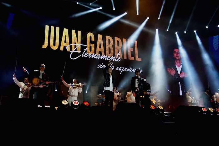 El emotivo espectáculo se desarrolló en un imponente escenario de 95 metros con una enorme pantalla de fondo que exhibía fragmentos de las actuaciones del "Divo de Juárez", como era conocido Juan Gabriel, fallecido el 28 de agosto del año pasado a los 66 años de edad, víctima de un infarto cardiaco, en Santa Mónica (Estados Unidos).