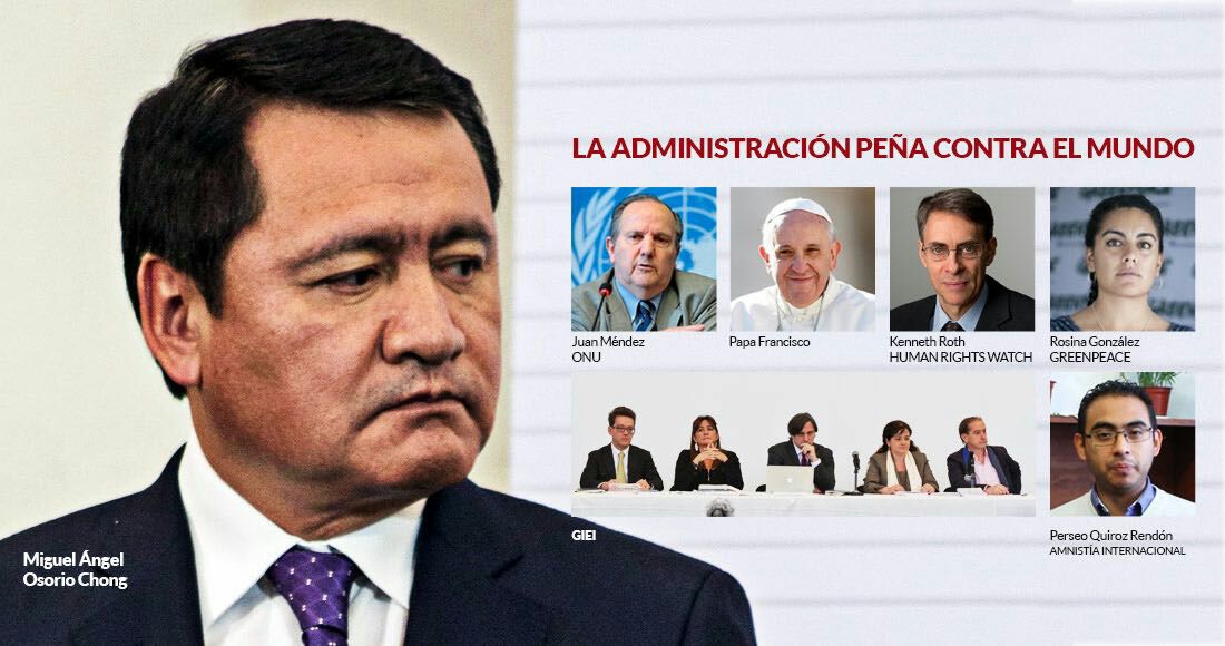Caracterizado por rechazar cada observación venida del extranjero. El Gobierno del Presidente Enrique Peña Nieto ha confrontado desde las palabras del Papa Francisco hasta las observaciones en materia de derechos humanos hechas por Naciones Unidas, Greenpeace, la Comisión Interamericana de Derechos Humanos, Amnistía Internacional y el Grupo Interdisciplinario de Expertos Independientes.
