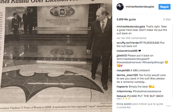 El actor estadounidense, Michael Keaton, compartió una imagen a través de su cuenta personal de Instagram en la que se observa al Presidente de Rusia, Vladimir Putin, caminar sobre el blasón de Batman, uno de los héroes insignia de DC; la imagen ya cuenta con más de 5 mil me gusta y ha generado mucha controversia entre distintos cibernautas que opinan que esta publicación tiene tintes políticos en contra de Vladimir Putin.