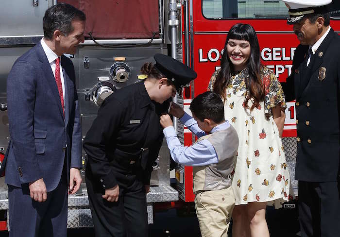 Los bomberos de la estación 89 del LAFD de North Hollywood recibieron a Pelayo hace siete años años. Con ellos se convirtió en cadete. Durante un año será una bombera a prueba en la estación de Rancho Park.