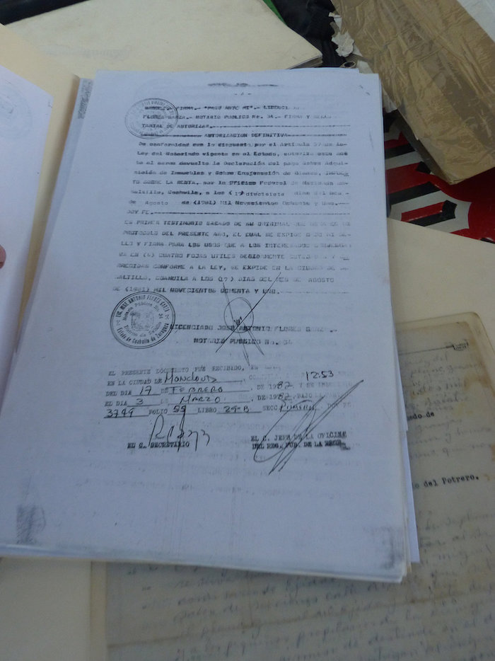“Estos predios siempre han sido de mis abuelos, de mis padres, desde 1877. Aquí está un inventario de todas las escrituras que tenemos, los derechos de agostadero y todo" dice Juan Flores.