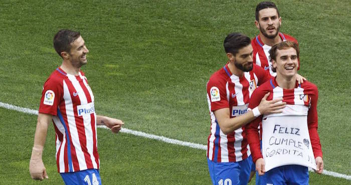 El delantero rojiblanco ha abierto el marcador en el Vicente Calderón y aprovechó para felicitar a su novia Erika Choperena por su cumpleaños.