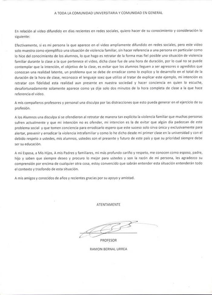 Mediante una carta publicada en el Facebook del propio docente, éste aceptó ser la persona que aparece en la filmación expresándose de manera misógina, humillante y violenta contra el género femenino.