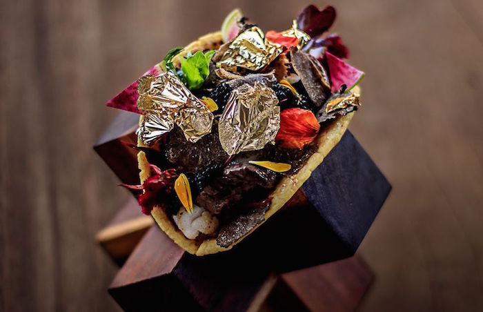 La delicia se prepara con una tortilla de maíz, llena de copos de oro con carne de ternera de Kobe, así como langostas y caviar. El taco más caro del mundo también contiene queso brie de trufas negras.