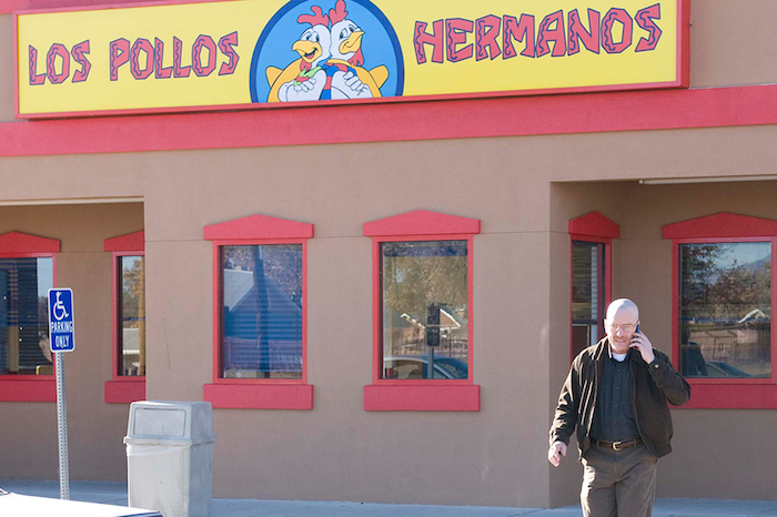 En Breaking Bad, "Los Pollos Hermanos" es una cadena de restaurantes de comida rápida propiedad de Fring (Giancarlo Esposito) que sirve en realidad como tapadera para blanquear dinero de un imperio con vínculos con carteles mexicanos y que aprovecha su red de transporte para distribuir la droga por E.U.