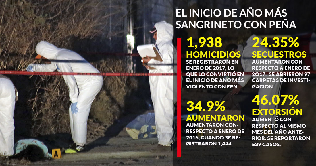 Según los documentos oficiales y las bases de datos consultadas por Zeta, solo en enero del 2017 en México se registraron 3 mil 6 víctimas de homicidios dolosos. Es la misma cifra que reporta el Secretariado Ejecutivo del Sistema Nacional de Seguridad Pública que depende de la Secretaría de Gobernación.