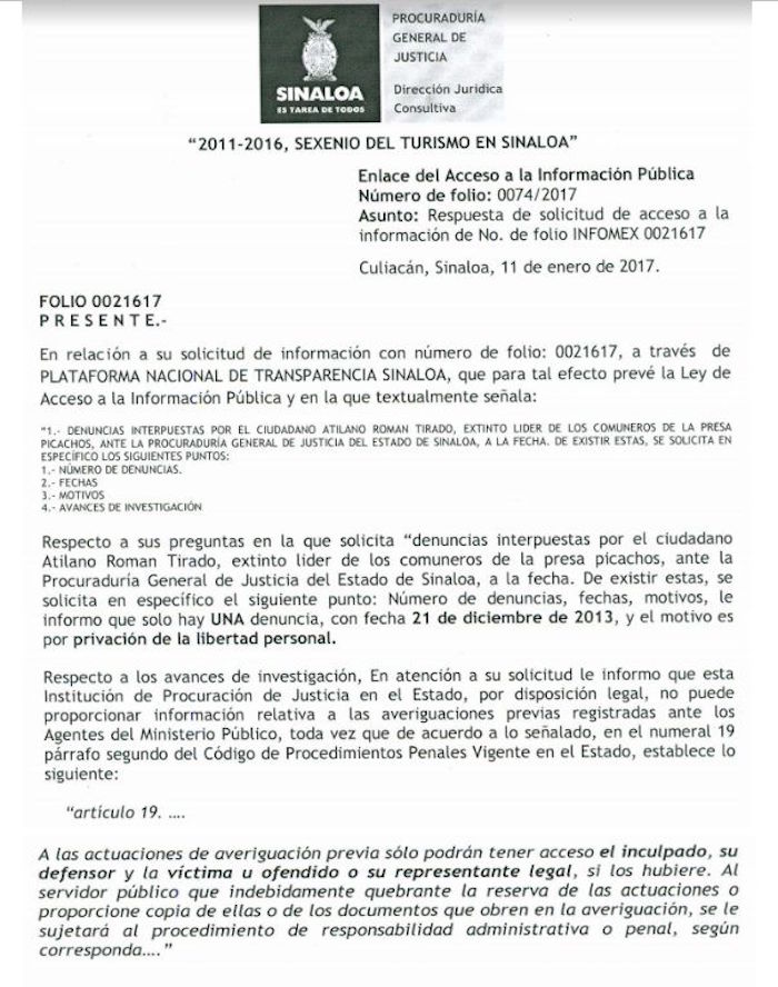 Al verificar en la Procuraduría General de Justicia del Estado, a través de una solicitud de información, Noroeste encontró que el líder de los desplazados interpuso una denuncia penal por privación ilegal de la libertad el 21 de diciembre de 2013. Sin embargo, por las reservas de ley, no se informó contra quién o quiénes, ni se dieron a conocer los avances de las investigaciones.