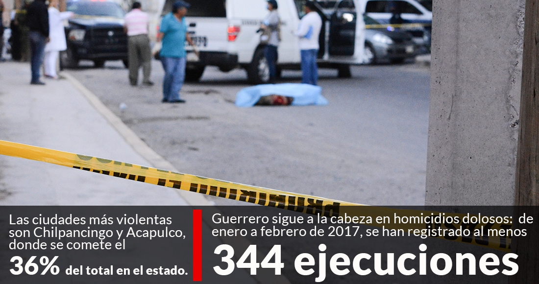 La violencia en Guerrero es generalizada por la cantidad de cárteles que se disputan la tercera entidad más pobre del país [65.2 por ciento de la población], pero además por la fallida estrategia de seguridad implementada por los gobiernos federal y estatal, que aunque presumen constantemente los “grandes cambios” y avances en materia de seguridad, el estado se mantiene como el número uno en homicidios dolosos [2 mil 844 en 2016].
