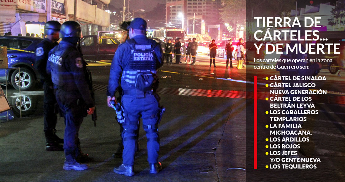 Guerrero ocupa el tercer lugar en pobreza [65.2 por ciento de la población] y el primero en homicidios [2 mil 844 en 2016] a nivel nacional. Con la presencia de al menos 10 cárteles, cinco de “primer nivel”, es la entidad más disputada por el crimen organizado. Su zona centro se ha convertido en un campo de batalla para dos organizaciones: Los Rojos y Los Ardillos, y posiblemente otra que las autoridades aún no identifican por completo. La presencia de 500 militares y policías estatales no ha logrado contener las desapariciones y ejecuciones que se vuelven cada vez más brutales.