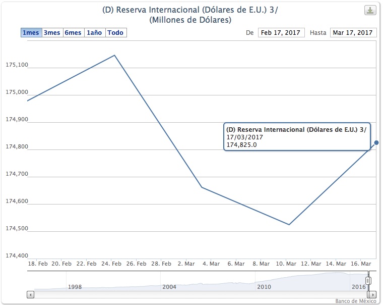 La semana previa, las reservas internacionales habían registrado una baja de 137 millones de dólares dejando un saldo al 10 de marzo fue de 174 mil 661 millones de dólares, el nivel más bajo en tres meses. Con el aumento de ésta semana, el saldo al 17 de marzo las reservas sumaron quedó en 174 mil 825 millones de dólares.