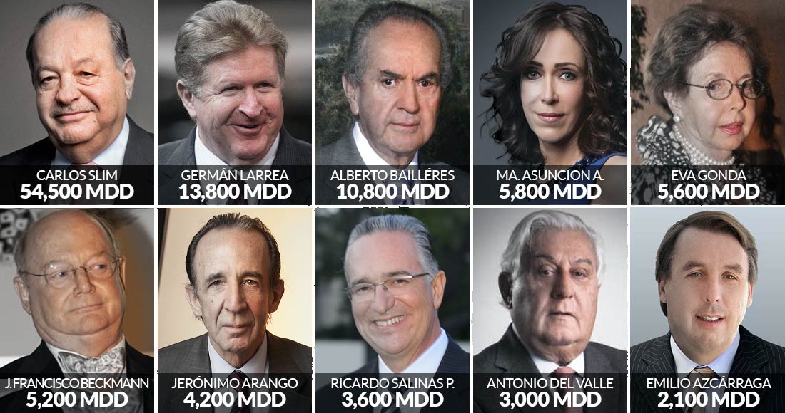 En México, de acuerdo con la lista más actualizada de Forbes, las diez personas más ricas son Carlos Slim Helú (América Móvil, 54 mil 500 millones de dólares); Germán Larrea Velasco (Grupo México, 13 mil 800 millones); Alberto Bailléres Gónzalez (Peñoles, 10 mil 800 millones); María Asunción Aramburuzabala (Fondo Tresalia, 5 mil 800 millones); Eva Gonda de Rivera (FEMSA, 5 mil 600 millones); Juan Francisco Beckmann Vidal (José Cuervo, 5 mil 200 millones); Jerónimo Arango (Cifra-Walmart, 4 mil 200 millones); Ricardo Salinas Pliego (TV Azteca, Grupo Electra, Banco Azteca, 3 mil 600 millones); Antonio del Valle Ruíz (Mexichem, BX+); y Emilio Azcárraga (Grupo Televisa, 2 mil 100 millones).