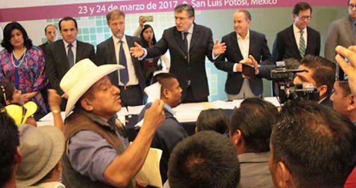Ayer, después de que el presidente de la Comisión Nacional de Derechos Humanos (CNDH), Raúl González Pérez halagara al Gobernador priista Juan Manuel Carreras López, porque su estado es de los pocos en contar con una Ley Indígena a nivel nacional, más de 50 representantes de la Coordinadora de Organizaciones Campesinas e Indígenas de la Huasteca Potosina, irrumpieron en el evento oficial y tras pararse frente al presídium culparon al Gobierno estatal y al Poder Legislativo de aprobar un Plan Estatal de Desarrollo (PED) sin haber realizado una verdadera consulta indígena lo que representan una violación a sus derechos.