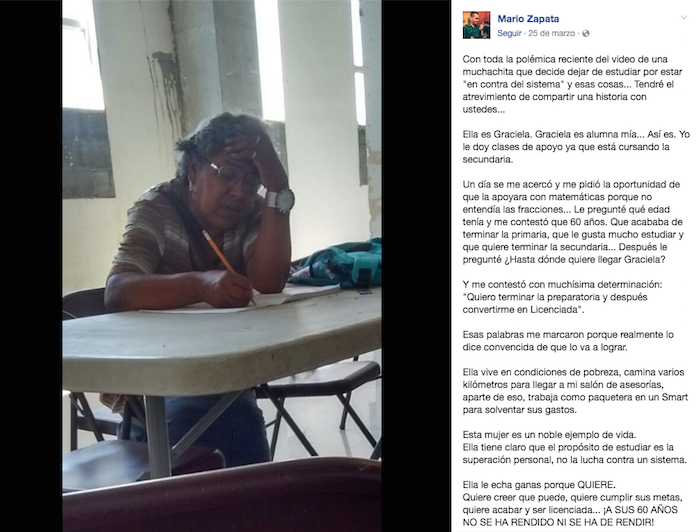 “Un día se me acercó y me pidió la oportunidad de que la apoyara con matemáticas porque no entendía las fracciones... Le pregunté qué edad tenía y me contestó que 60 años. Que acababa de terminar la primaria, que le gusta mucho estudiar y que quiere terminar la secundaria...'', continuó el relato de Zapata.