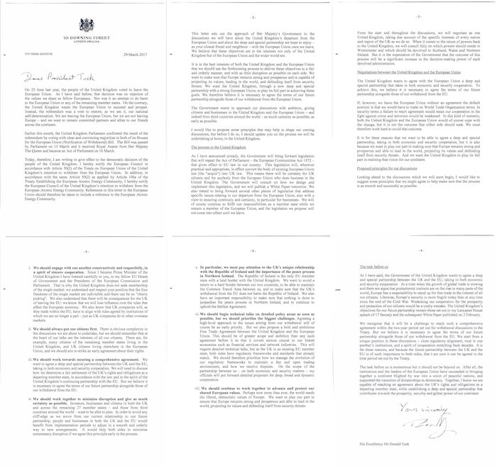 Éste es el resumen de los principales puntos contenidos en la misiva remitida por la primera ministra británica, Theresa May, al presidente del Consejo Europeo, Donald Tusk, con la notificación formal de su voluntad de marcharse del bloque común.