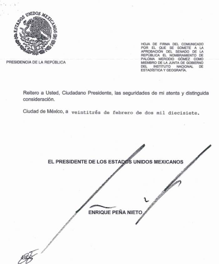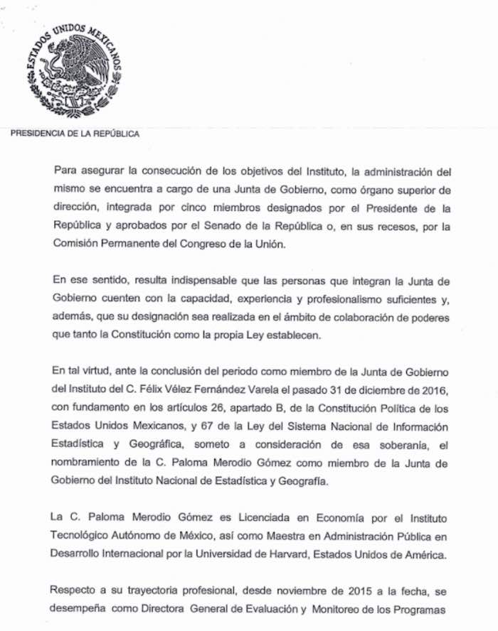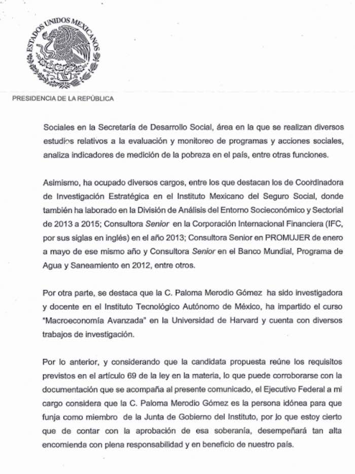 EL DICHO: “La candidata propuesta reúne los requisitos previstos en el artículo 69 de la ley en la materia, lo que puede corroborarse con la documentación que se acompaña […], el Ejecutivo Federal a mi cargo considera que la C. Paloma Merodio Gómez es la persona idónea para que funja como miembro de la Junta de Gobierno del Instituto, por lo que estoy cierto que de contar con la aprobación de esta soberanía, desempeñará tan alta encomienda con plena responsabilidad y en beneficio de nuestro país” (Enrique Peña Nieto, Presidente de la República, 23 de febrero de 2017).