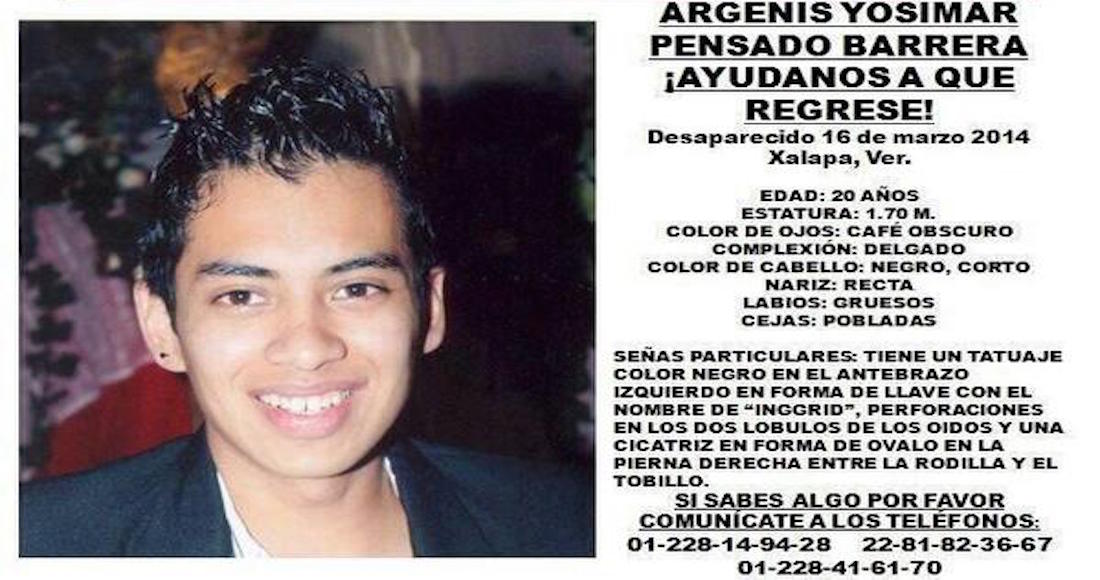 Argenis Yosimar Pensado Barrera desapareció en marzo de 2014. La investigación realizada por la Fiscalía General del Estado de Veracruz no les ha dado ninguna respuesta sobre la causa de la desaparición y mucho menos el paradero del joven. El caso se complicó cuando los testigos citados para dar con del joven fueron asesinados en una balacera en Banderilla, a 15 minutos de la localidad donde fue visto por última vez Yosimar.