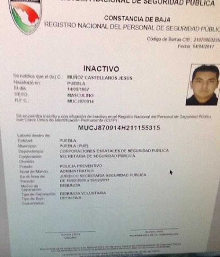 Además, la Secretaría de Seguridad Pública informó que trabajó como policía preventivo del 16 de diciembre de 2009, al 15 de febrero de 2011.