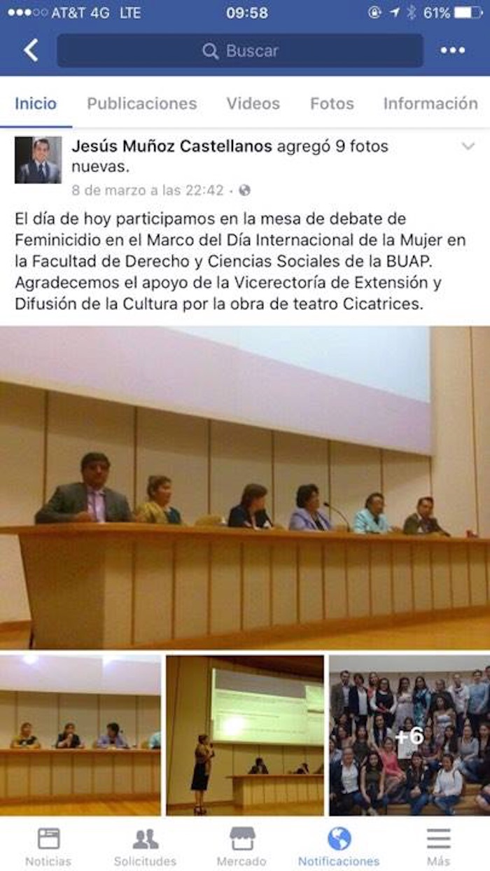 De acuerdo con su página pública de Facebook, apenas el pasado 8 de marzo presumió que se encontraba en un evento del Día de la Mujer y una mesa de debate sobre Feminicidio.