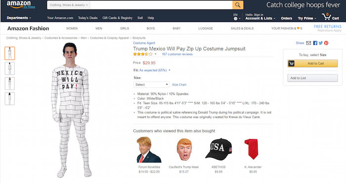 "El disfraz anunciado en el sitio de internet de Amazon promueve esta xenofobia despreciable que no es otra cosa que una versión moderna de la túnica del (grupo racista) Ku Klux Klan", agrega en su mensaje.