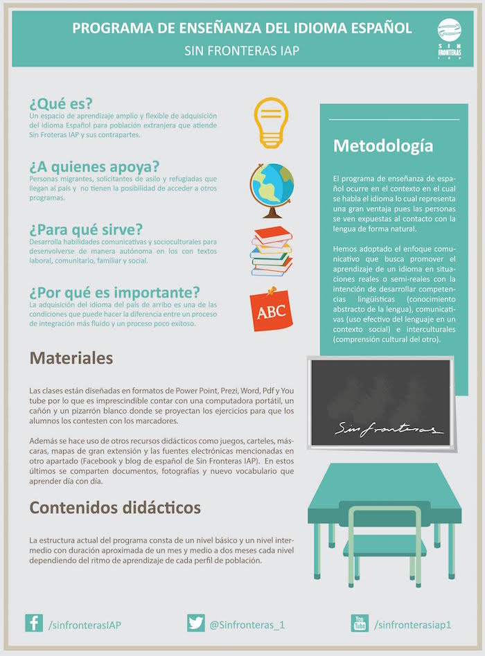 El programa de enseñanza de español de Sin Fronteras I.A.P. ha sido resultado de un proceso de trabajo de ocho años de colaboración de voluntarios de la organización y del apoyo de instituciones como Amnistía Internacional, La Casa Espacio del Refugiado, la Casa de los Amigos y el ACNUR.