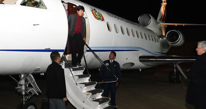 El avión presidencial aterrizó pasadas las 20:20 hora local (0:20 GMT del jueves) en el aeropuerto de la ciudad central de Cochabamba.