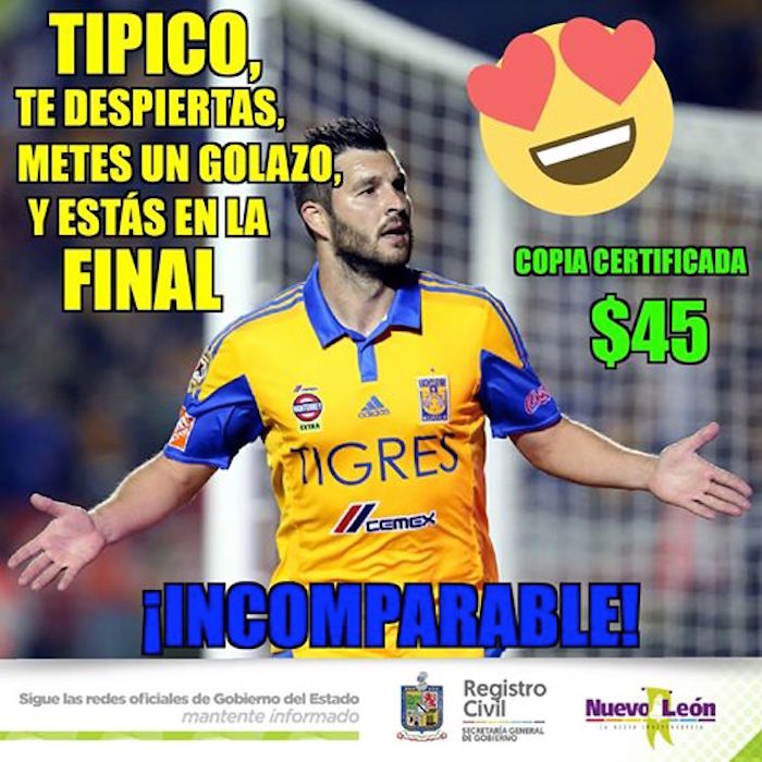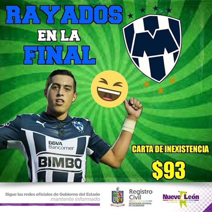 De nueva cuenta la dependencia aprovechó el futbol para dar a conocer sus servicios. “Rayados en la final, Carta de Inexistencia $93”, fue lo que anunció el Registro Civil en un meme publicado en Facebook.
