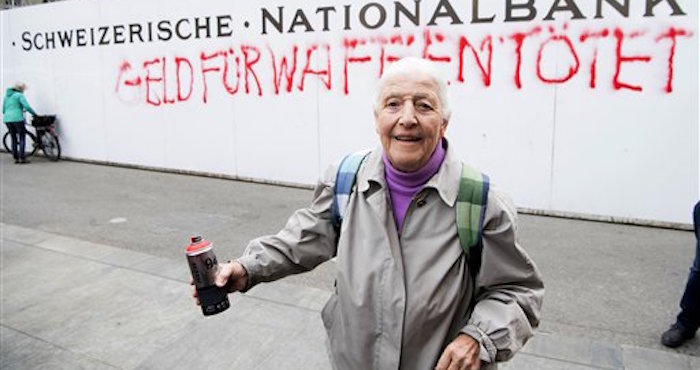 Una activista de 86 años es detenida en Ginebra por grafitear: “El dinero para armas mata”