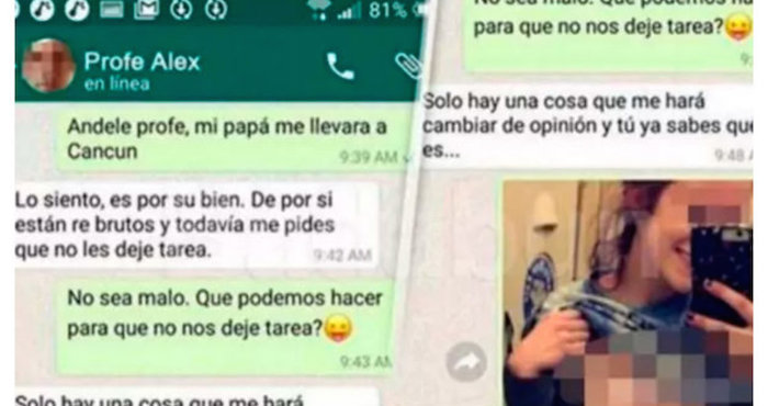 El padre de una joven de 16 años descubrió los chats entre su hija y el profesor en el teléfono celular de la menor, por lo que presentó una denuncia en contra del docente, identificado como solo como "El Profe Alex", quien está prófugo.