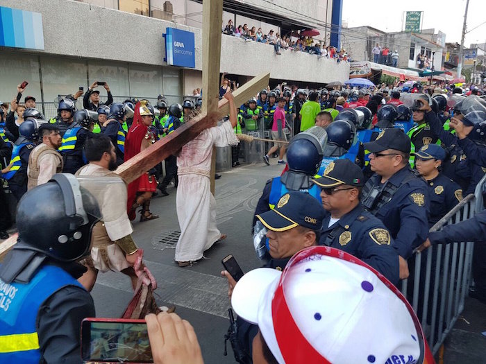El actor que representa a Cristo y elementos de seguridad. Foto: Twitter @Del_Iztapalapa