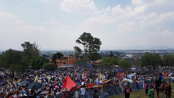 Miles de feligreses esperan la llegada de la caravana al Cerro de la Estrella. Foto: Twitter @Del_Iztapalapa