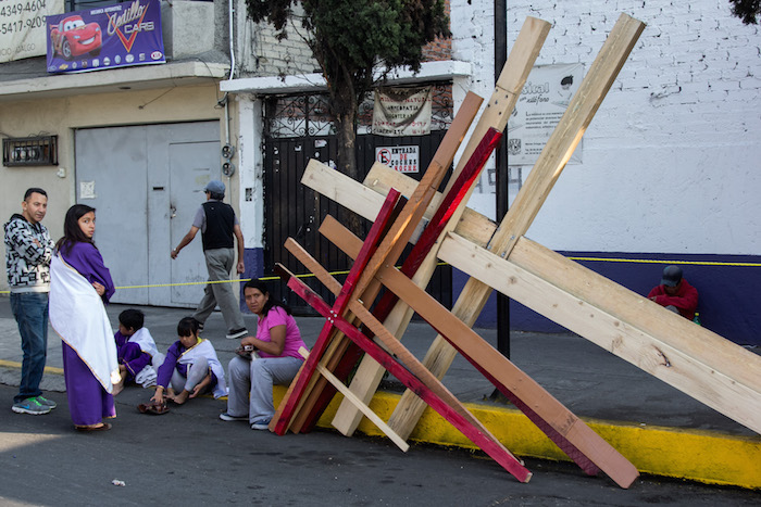 Con sus tradicionales vestimentas moradas con blanco y cargando las cruces, se inició el tradicional recorrido por las calles de la delegación Iztapalapa. Foto: Cuartoscuro.