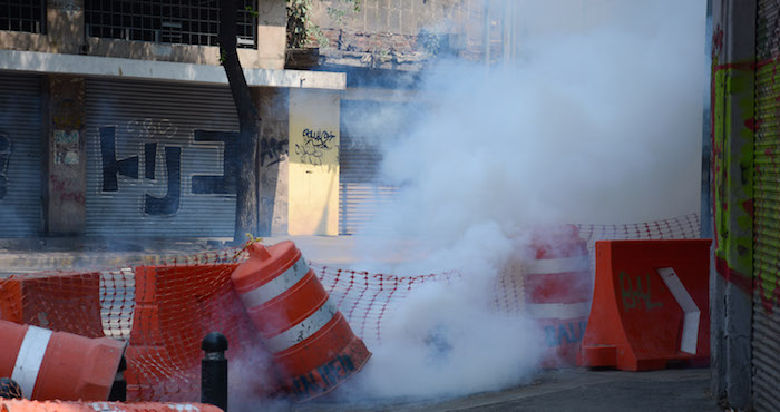 Los manifestantes golpearon con piedras y palos las vallas metálicas colocadas en Bucareli esquina con Ayuntamiento. Después, arrojaron piedras a los elementos de seguridad que contestaron con las bombas de gas.