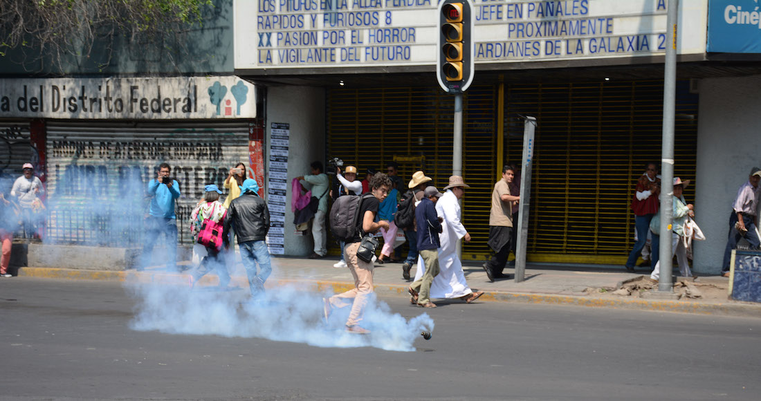 Ciudad de México, 25 de abril (SinEmbargo).- La protesta de activistas y padres de los 43 normalistas desaparecidos de Ayotzinapa, frente a la Secretaría de Gobernación, fue dispersada con gas lacrimógeno lanzado por granaderos que resguardaba el inmueble.