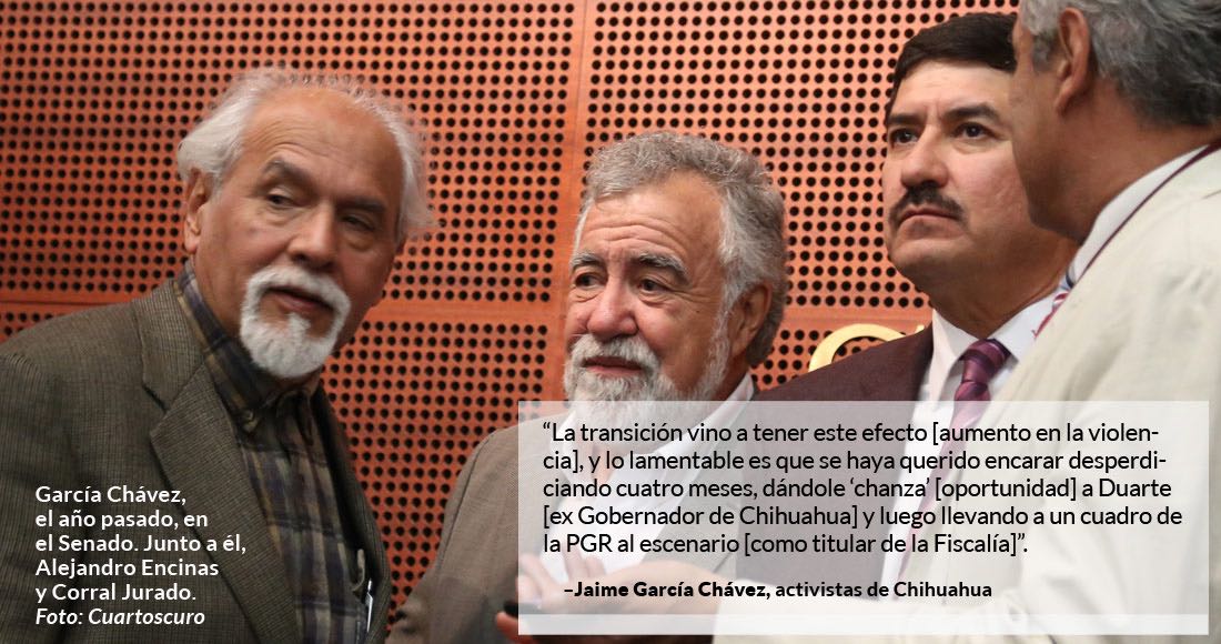 “Lo que advierto es que, en el esquema del Gobierno de César Duarte, había una política en relación al crimen organizado y al narcotráfico, una política de gobernarlo mas no combatirlo”, advirtió el abogado chihuahuense Jaime García Chávez en marzo pasado, luego del asesinato de la periodista y corresponsal de La Jornada, Miroslava Breach Velducea.