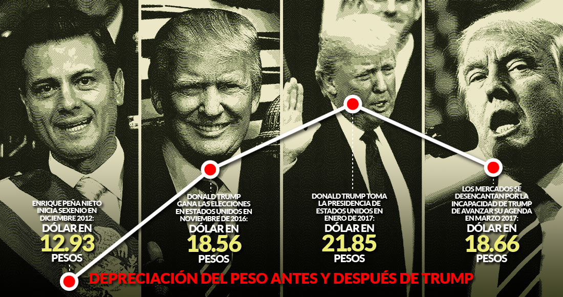 La cifra de la devaluación del peso en el Gobierno de Peña Nieto es muy lejana a la de la crisis; pero muy superior a lo registrado con Felipe Calderón y Vicente Fox. Con el primero, la depreciación fue de 18.28 por ciento y con Vicente Fox (2000-2006) se debilitó en 16.81 por ciento. “En la población es un efecto psicológico porque en México, los colapsos de la moneda han llegado a provocar inflación de tres dígitos y marcadas recesiones. En tres décadas, el dólar y sus caídas han estado asociados con la ansiedad y el miedo”, apunta Eduardo Murueta Reyes, director de la Asociación Mexicana de Alternativas en Psicología (Amapsi) con especialidad en Psicología del Poder.