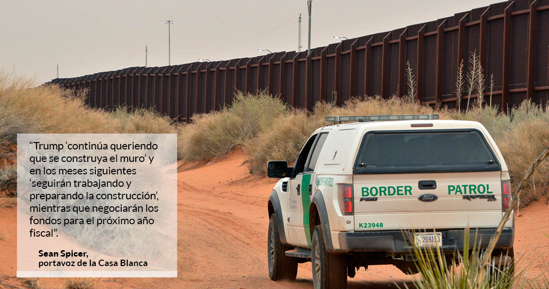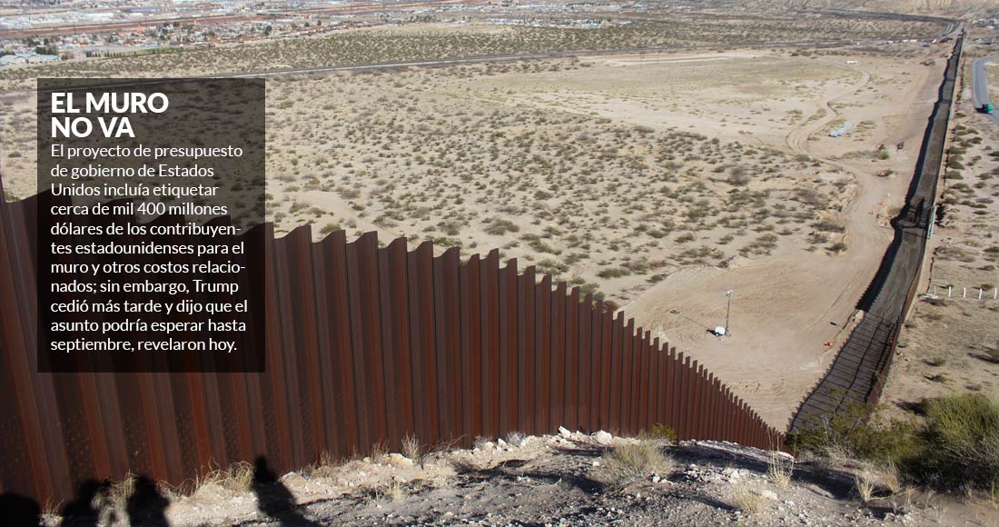 El proyecto de presupuesto de gobierno de Estados Unidos incluía etiquetar cerca de mil 400 millones dólares de los contribuyentes estadounidenses para el muro y otros costos relacionados; sin embargo Trump cedió más tarde y dijo que el asunto podría esperar hasta septiembre, revelaron hoy. La Casa Blanca también se retractó de eliminar subvenciones a las "ciudades santuario" como se conoce a aquellos municipios que no comparten con las autoridades federales información sobre la condición migratoria de algunas personas. Aunque Trump no logró el financiamiento para su muro, sí ganó el anticipo de 15 mil millones de dólares en su solicitud de fortalecer las fuerzas militares.