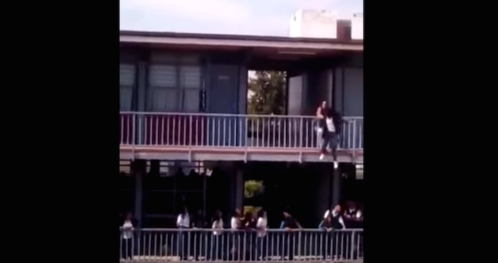 En un video difundido en redes sociales se observa cómo la joven se encuentra parada frente a uno de los barandales de los pasillos. A pesar de el esfuerzo de los profesores y de que una mujer intentó sujetarla por la espalda, la menor se lanzó y de manera abrupta al suelo.
