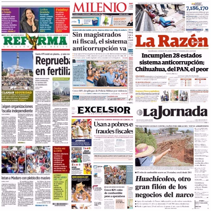 En La Razón: Incumplen 28 estados sistema anticorrupción; Chihuahua, del PAN, el peor. A menos de 48 horas de que entre en vigor del Sistema Nacional Anticorrupción (SNA), el 75 por ciento de los Sistemas Locales Anticorrupción entrarán en funcionamiento sin fiscales anticorrupción y sin la conformación de los Tribunales de Justicia Administrativa, al igual que a nivel federal.