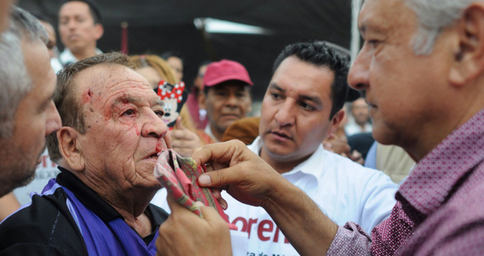 AMLO le limpia la sangre a un hombre que resbaló ayer, 7 de mayo, cuando la multitud se agolpó para saludarlo en un evento en el deportivo La Colmena. Foto: Cuartoscuro